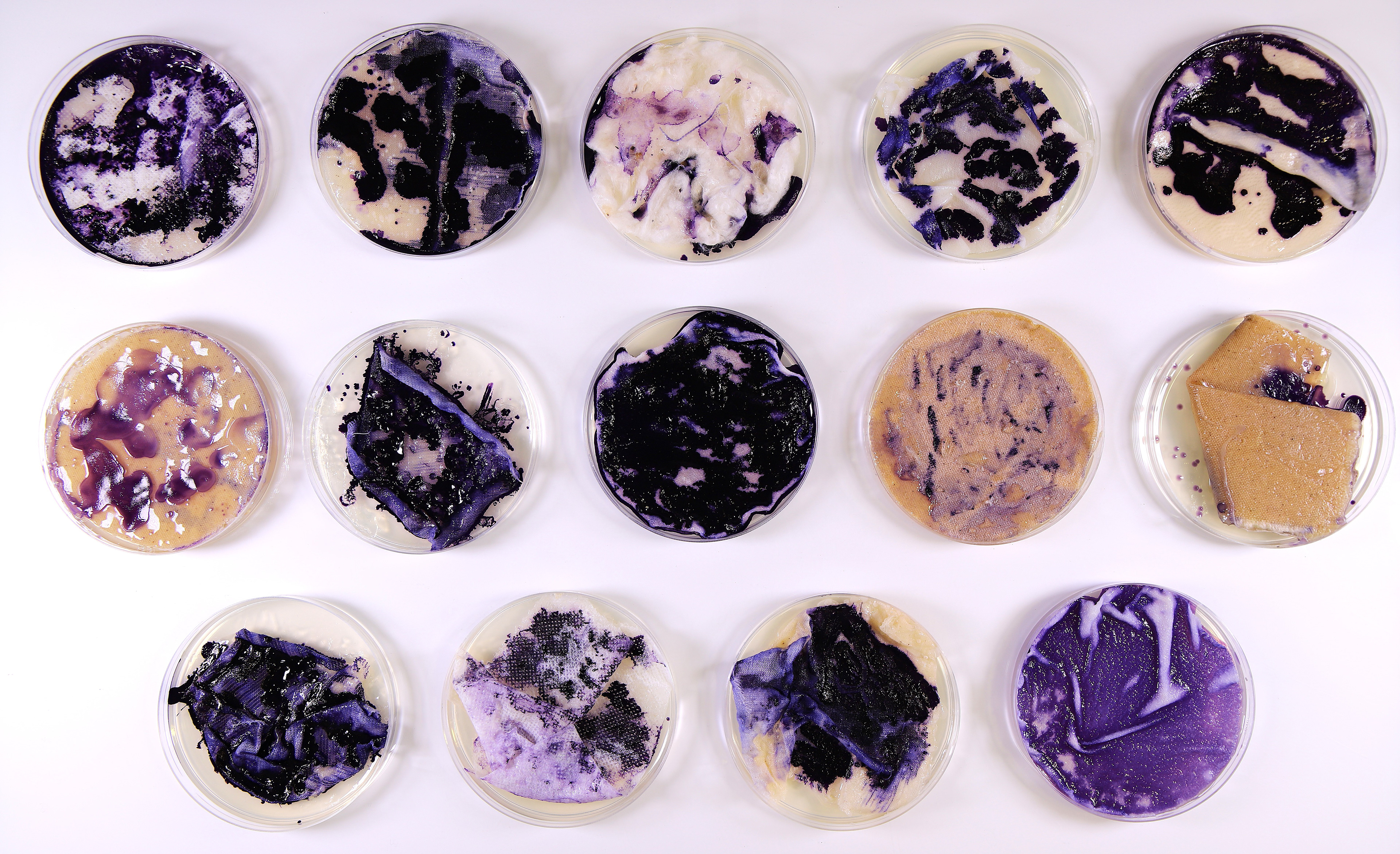 This phase of the project involved lab experiments to test the growth of Janthinobacterium lividum, a bacteria producing a natural purple pigiment called violacein, on various fabrics such as viscose, cotton calico, Tyvek, and wool. Different inoculation techniques and washing methods were applied. Through steps including fabric sterilization, bacteria inoculation, and growth monitoring, a range of dyed samples was produced, showcasing diverse properties and potential applications.